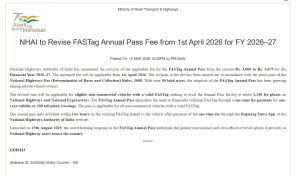 The National Highways Authority of India (NHAI) has announced a revision to the FASTag Annual Pass fee for FY 2026–27.