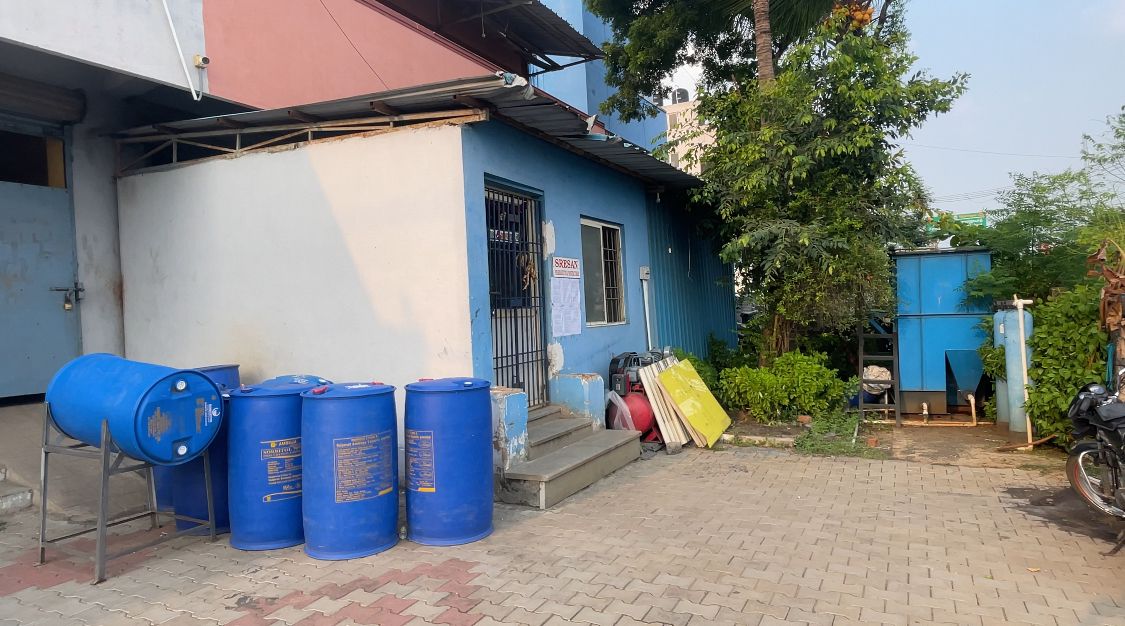 Outside the facility, an effluent treatment plant and large blue-and-white chemical drums stand amid discarded liquor bottles and used gloves strewn nearby. Peering through the window, the interior contrasts sharply with what one would expect from a medical manufacturing facility.