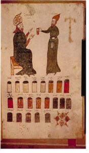 A picture shows Theophilus receiving a flask of urine along with 21 other flasks containing urines of progressively changing colours. This chart represented a spectrum of potential health conditions, from pale yellow indicating good health to darker or reddish tones suggesting fever, dehydration, or other ailments.