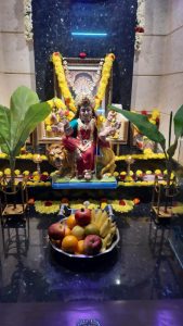 This kalasha represents the Goddess Durga. Devotees draw colourful rangolis, light lamps, perform aarti, recite shlokas, and offer special dishes, sweets and fruits every day. Married women and children, especially little girls, are called in and then honoured by gifting betel leaves, coconuts, fruits, flowers, bangles, turmeric, kumkum, and prasad.