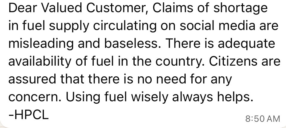 “Dear valued customer, claims of a shortage in fuel supply circulating on social media are misleading and baseless. There is adequate availability of fuel in the country. Citizens are assured that there is no need for concern. Using fuel wisely always helps,” a message from HP read.