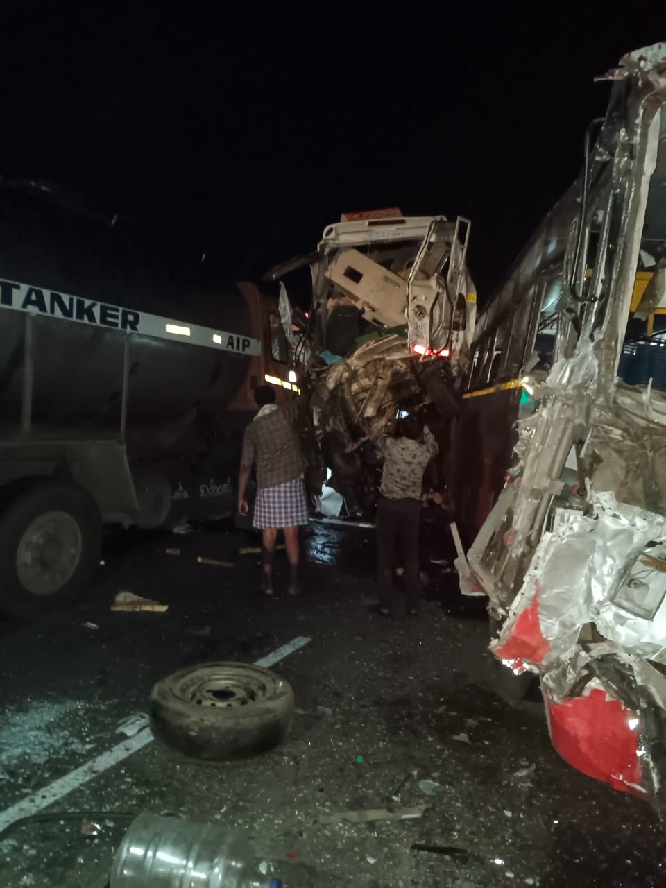 The milk tanker is said to have collided with the tempo traveller with full impact, after which it collided with the KSRTC bus before coming to a halt.