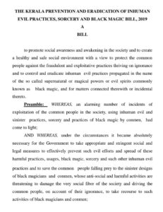 The Kerala Prevention and Eradication of Inhuman Evil Practices, Sorcery and Black Magic Bill, 2019, aimed to protect citizens by criminalising a wide spectrum of inhuman practices amid a growing number of disturbing incidents in which vulnerable people were abused, defrauded, assaulted or psychologically terrorised by self-styled godmen and occult practitioners.