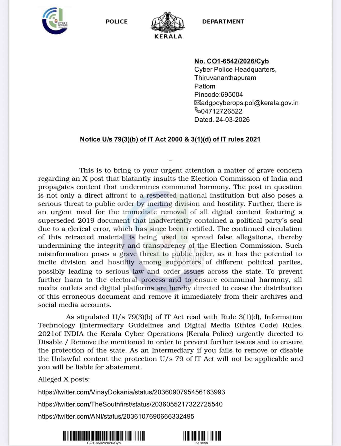 “The post in question is not only a direct affront to a respected national institution but also poses a serious threat to public order by inciting division and hostility,” the notice, dated 24 March and issued under Section 79(3)(b) of the IT Act 2000 and 3(1)(d) of the IT Rules 2021, reads.