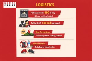 With April heat a concern, arrangements include drinking water and seating facilities at polling stations. Mobile phones will not be permitted inside; voters will need to deposit them at designated counters before entering.