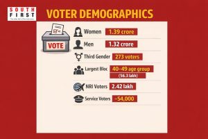 The scale of participation is striking. Kerala has 2.71 crore voters (2,71,42,952) this time — 1.39 crore women (1,39,21,868), 1.32 crore men (1,32,20,811), and 273 voters from the third gender category. Added to this are 2.42 lakh Non-Resident Indian voters (2,42,093) and nearly 54,000 service voters.