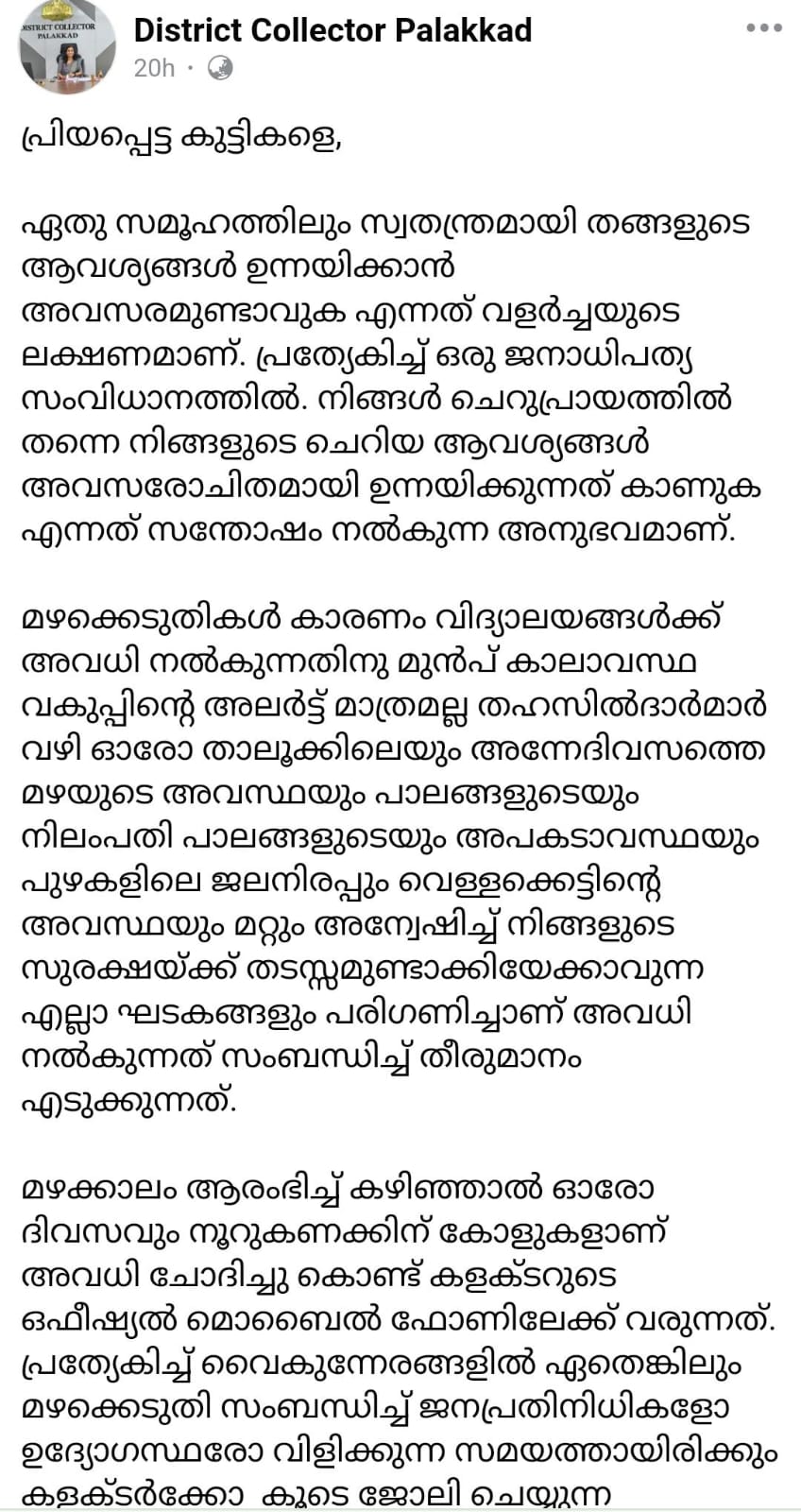 “I am announcing that the educational institutions of Idukki will remain closed today. The District Collector’s order in this regard will follow,” reads one post.