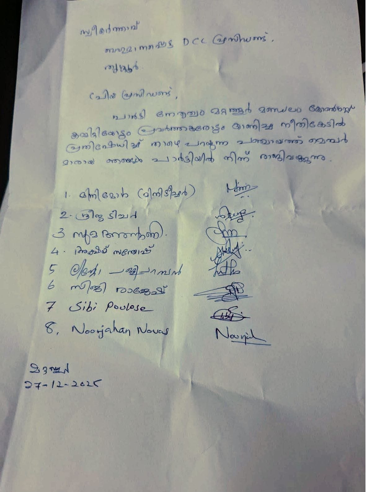 In their resignation letters, the former Congress members accused the party leadership of persistently neglecting the mandalam Congress committee and grassroots workers. They claimed their protest stemmed from long-standing organisational grievances rather than any ideological realignment.