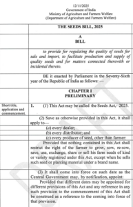 The Union government has said that the Seeds Bill 2025 is designed to curb the sale of spurious and poor-quality seeds by introducing key regulatory mechanisms.