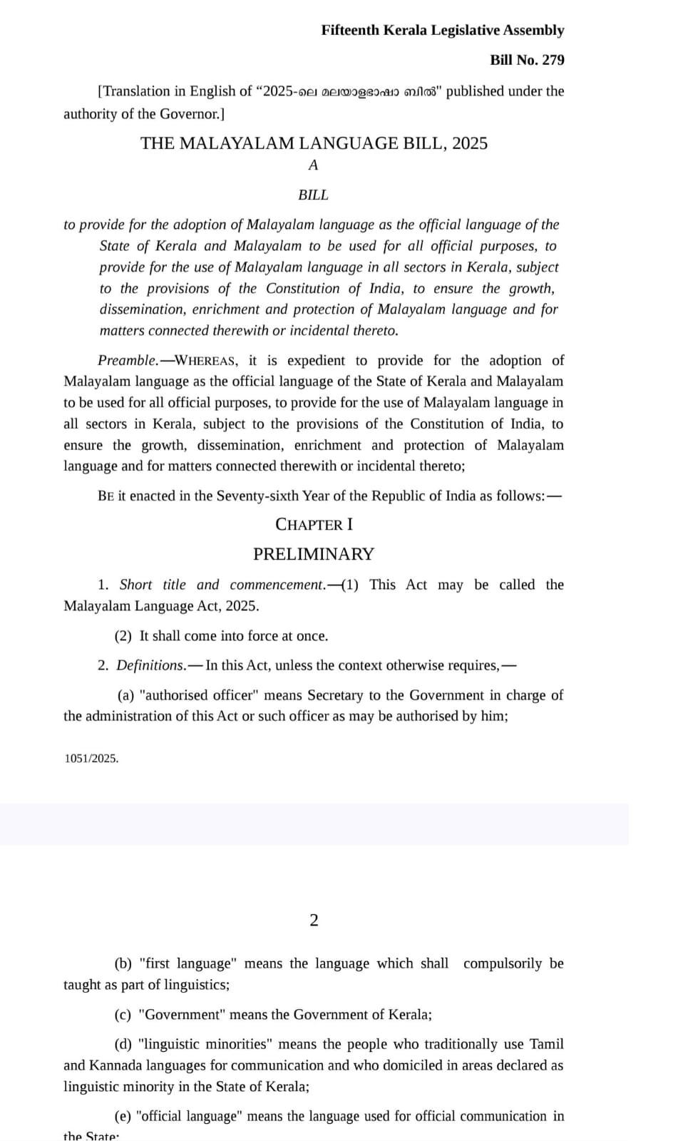 The bill designates Malayalam as the sole official language of Kerala and mandates its use across government administration, education, the judiciary, public communication, commerce and the digital domain, subject to constitutional provisions.