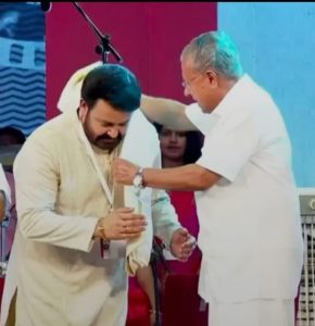 CM Pinarayi Vijayan felicitating Mohanlal