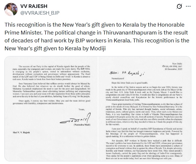 Prime Minister Narendra Modi’s congratulatory letter to newly elected Mayor VV Rajesh framed the Thiruvananthapuram victory as “epoch-making” and symbolic of Kerala’s readiness, especially its youth and women, for a “new dawn”.