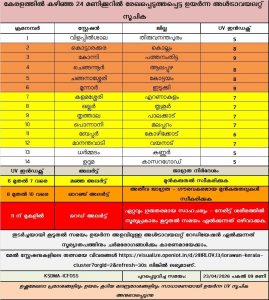 Against the UV exposure, an orange alert, signalling extreme caution, has been issued for Kollam, Pathanamthitta, Alappuzha, Kottayam and Idukki districts. A yellow alert remains in place for Ernakulam, Thrissur, Palakkad, Malappuram, Kozhikode and Wayanad.