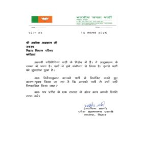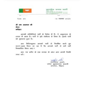 Also, Katihar Mayor Usha Agarwal was also suspended for alleged anti-party activities, making her the third leader disciplined in the ongoing crackdown.