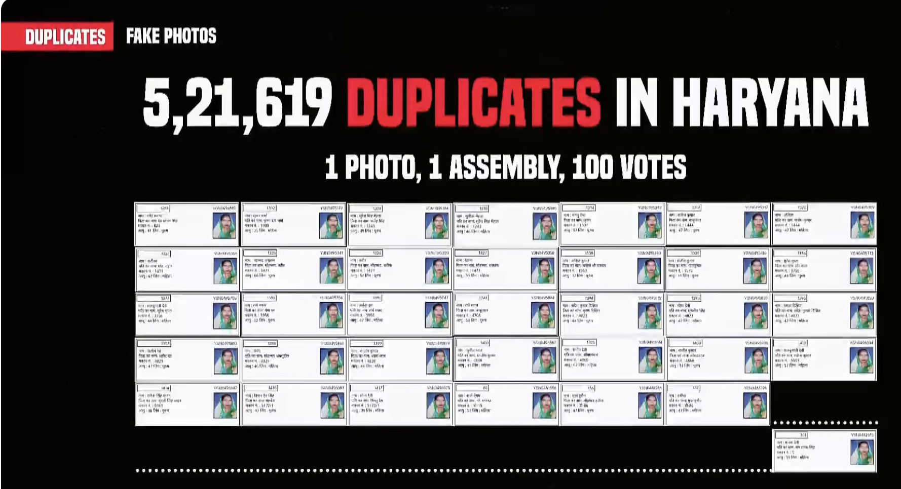 He said there are 5.2 lakh entries across Haryana with the same name, relative name and age within the same constituency. “There are also 1.2 lakh entries where many “voters” share the same photograph. Shockingly, many people have the same photograph but different names,” Rahul Gandi said.