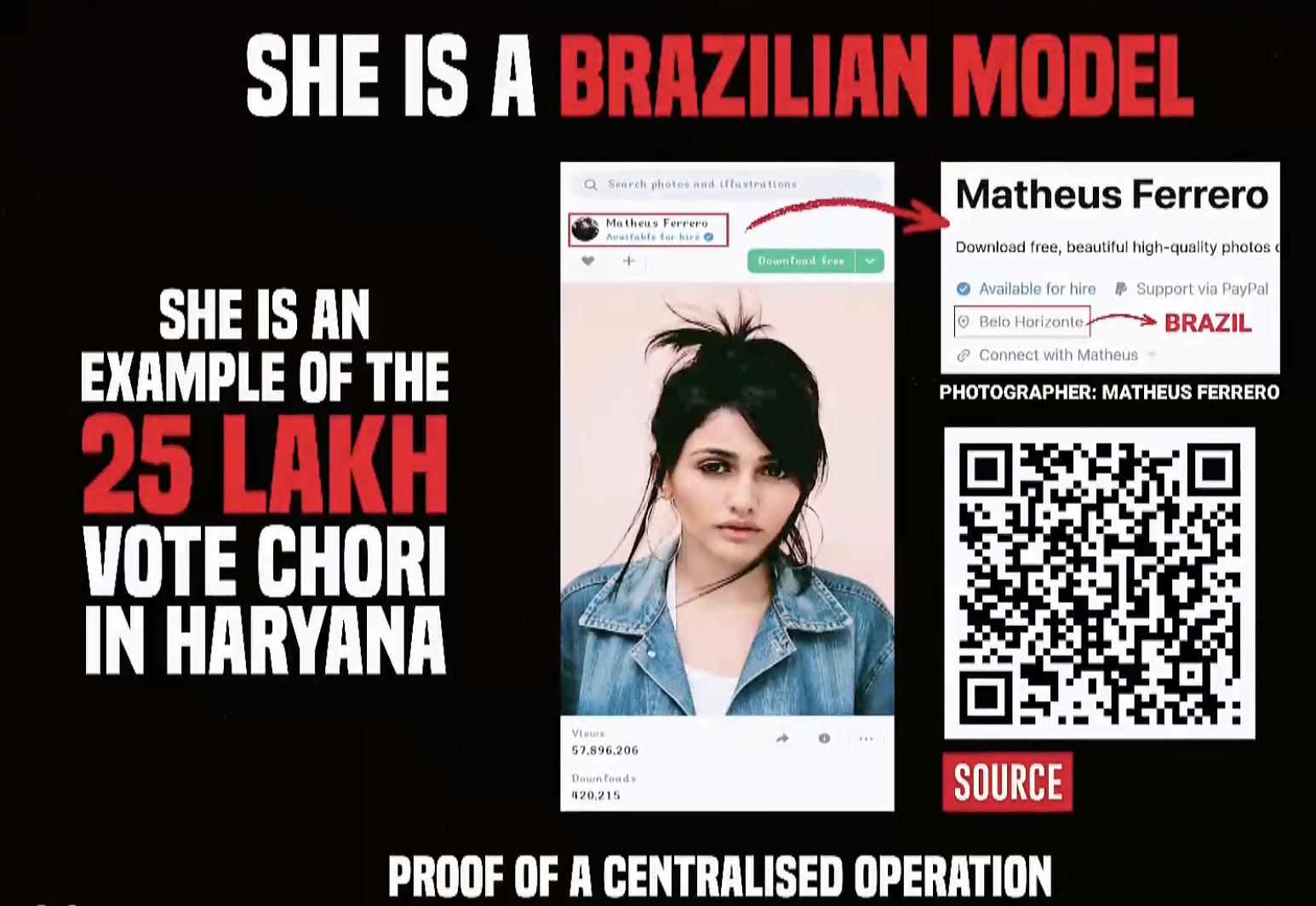 “But here’s the shocking part: she’s a Brazilian model. She is one among 25 lakh fake voters in Haryana’s voter list,” he added and displayed a QR code linking to the model’s social media page.