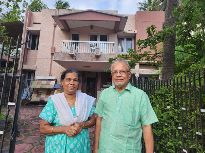Leelamma Abraham and Abraham Thomas outside their home in Thiruvananthapuram moments after Bharat Jodo Yatra led by Rahul Gandhi passed by. (Anusha Ravi Sood/South First)