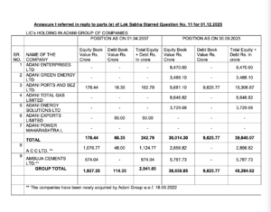 In a written reply to Starred Question No. 11 in Parliament, Finance Minister Nirmala Sitharaman on Monday, 1 December confirmed that LIC had invested ₹5,000 crore in secured non-convertible debentures (NCDs) issued by Adani Ports and Special Economic Zone (APSEZ) in May 2025, taking the total investment to ₹38,658.85 crore in equity and ₹9,625.77 crore in debt across various Adani Group companies.