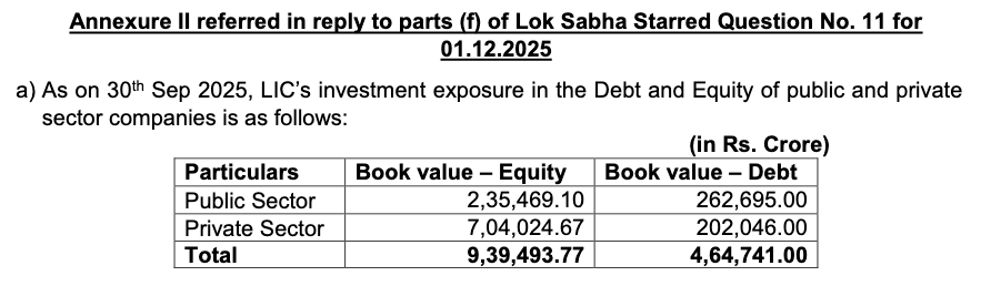 The ministry said that LIC’s holdings broadly reflect investments across the top 500 companies listed on the NSE and BSE, with a “major portion” concentrated in larger firms.