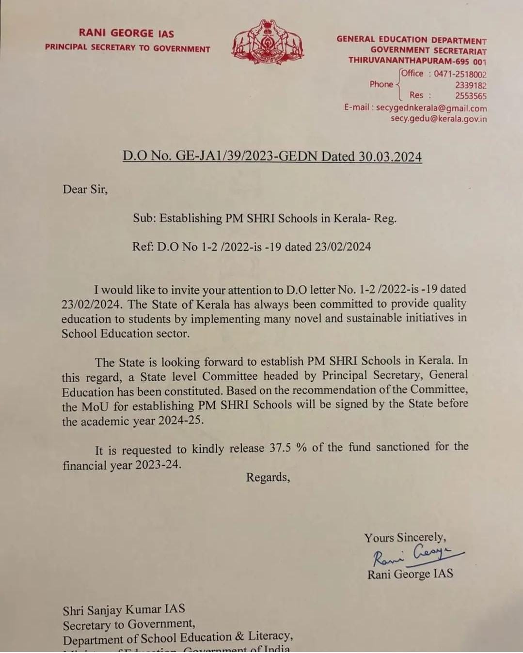 In March 2024, then Principal Secretary (General Education) Rani George IAS wrote to the Union Education Secretary, expressing Kerala’s readiness to sign the MoU before the 2024–25 academic year.