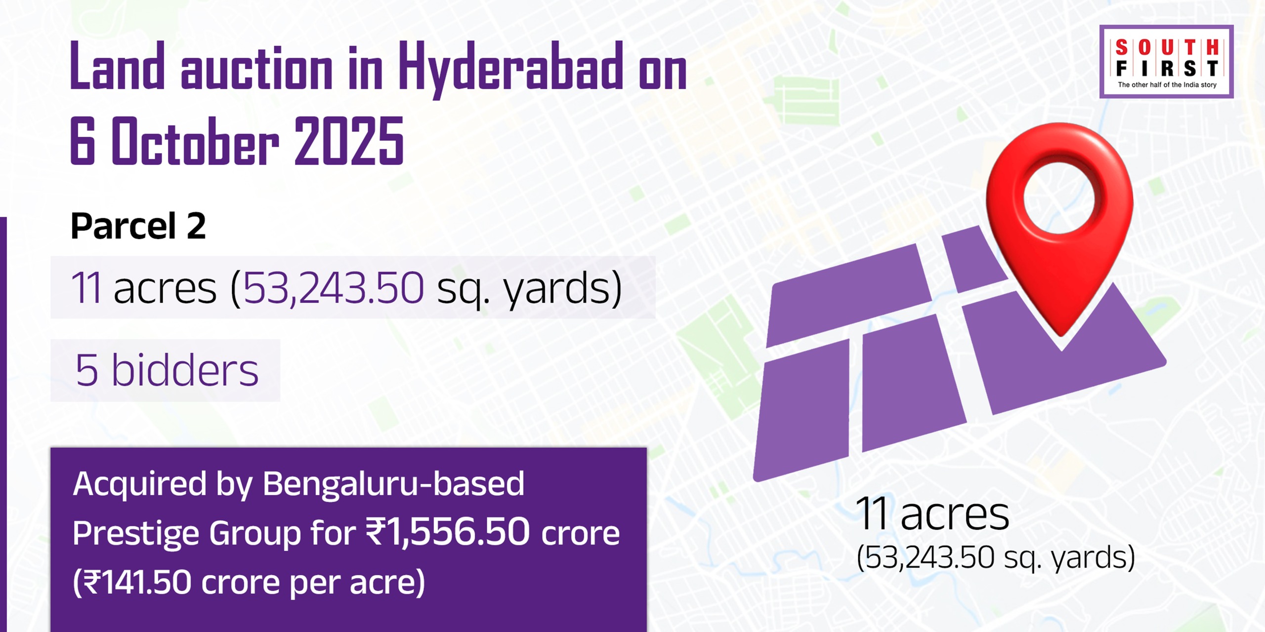 This plot was acquired by the Prestige Group, headquartered in Bengaluru, for ₹141.50 crore per acre, amounting to ₹1,556.50 crore. Five bidders took part, driving the price well above expectations.