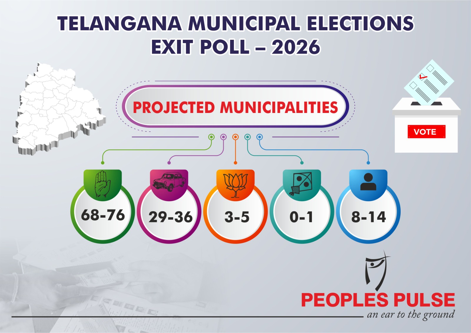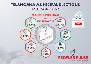 The ruling Congress is poised to capture nearly 70 percent of the 116 municipalities and seven municipal corporations that went to the polls in Telangana on 11 February, according to People’s Pulse exit poll surveys.