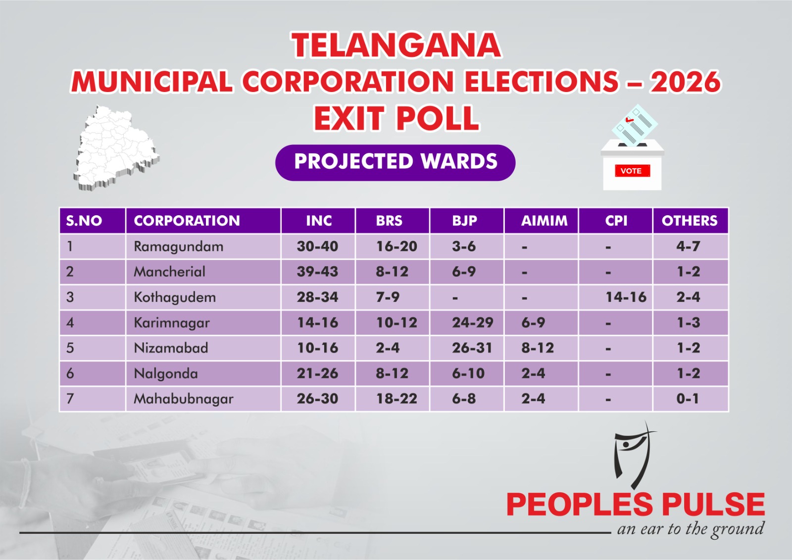 In Ramagundam municipal corporation, Congress is likely to win 30–34 wards, the BRS 16–20, the BJP 3–6 and Others 4–7.