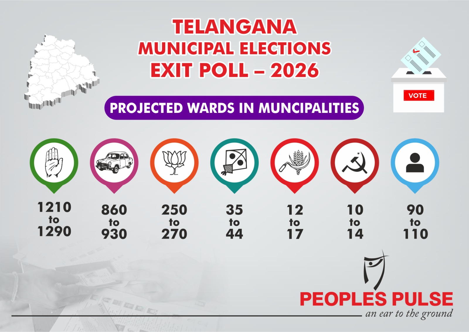 Projected ward wins across the State are: Congress 1,210–1,290; BRS 860–930; BJP 250–270; AIMIM 35–44; CPI 12–17; CPM 10–14; and Others 90–110.
