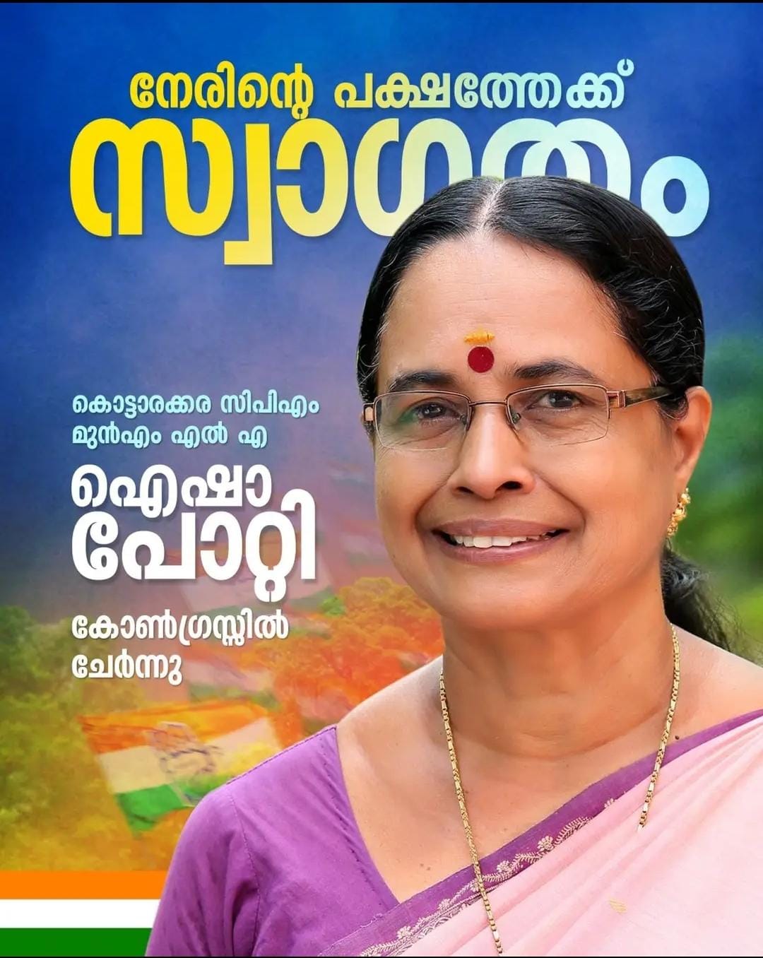 Aisha Potty’s entry into the Congress is especially significant with just months to go before the 2026 Assembly polls. Her move arms the UDF with a credible challenger in Kottarakkara, a seat currently held by Finance Minister KN Balagopal.